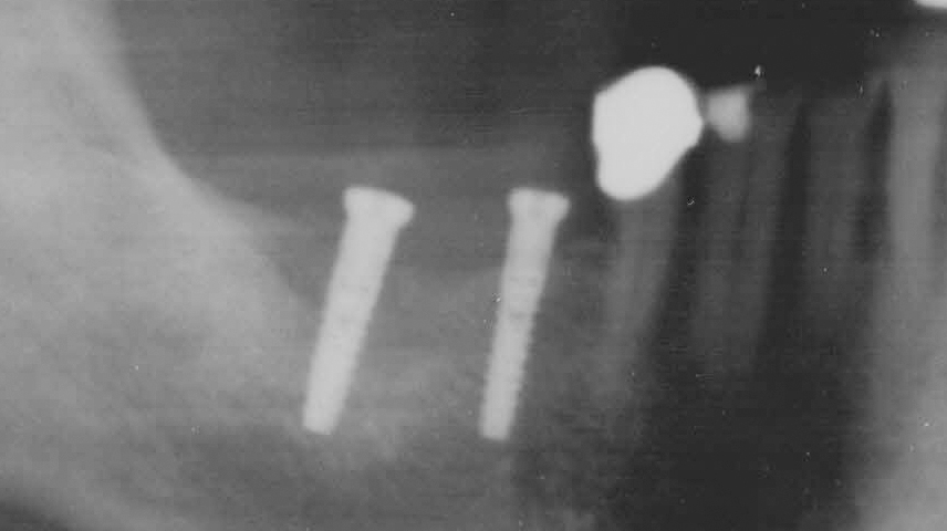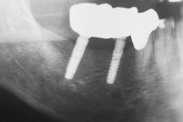 A 70-year-old patient sought treatment for discomfort in the right mandible, specifically in an area where a bridge had been in place for approximately 30 years. We found that the mesial bridge abutment at tooth 45 was subcoronally destroyed. Additionally, tooth 47 exhibited tenderness when pressure was applied to the bite block. Given the patient‘s age and the condition of the jawbone, we aimed to avoid augmentation. Instead, our treatment plan involved placing particularly narrow implants in the atrophied areas. Due to the absence of an antagonist tooth, it was determined that replacing tooth 47 with a third implant was unnecessary.