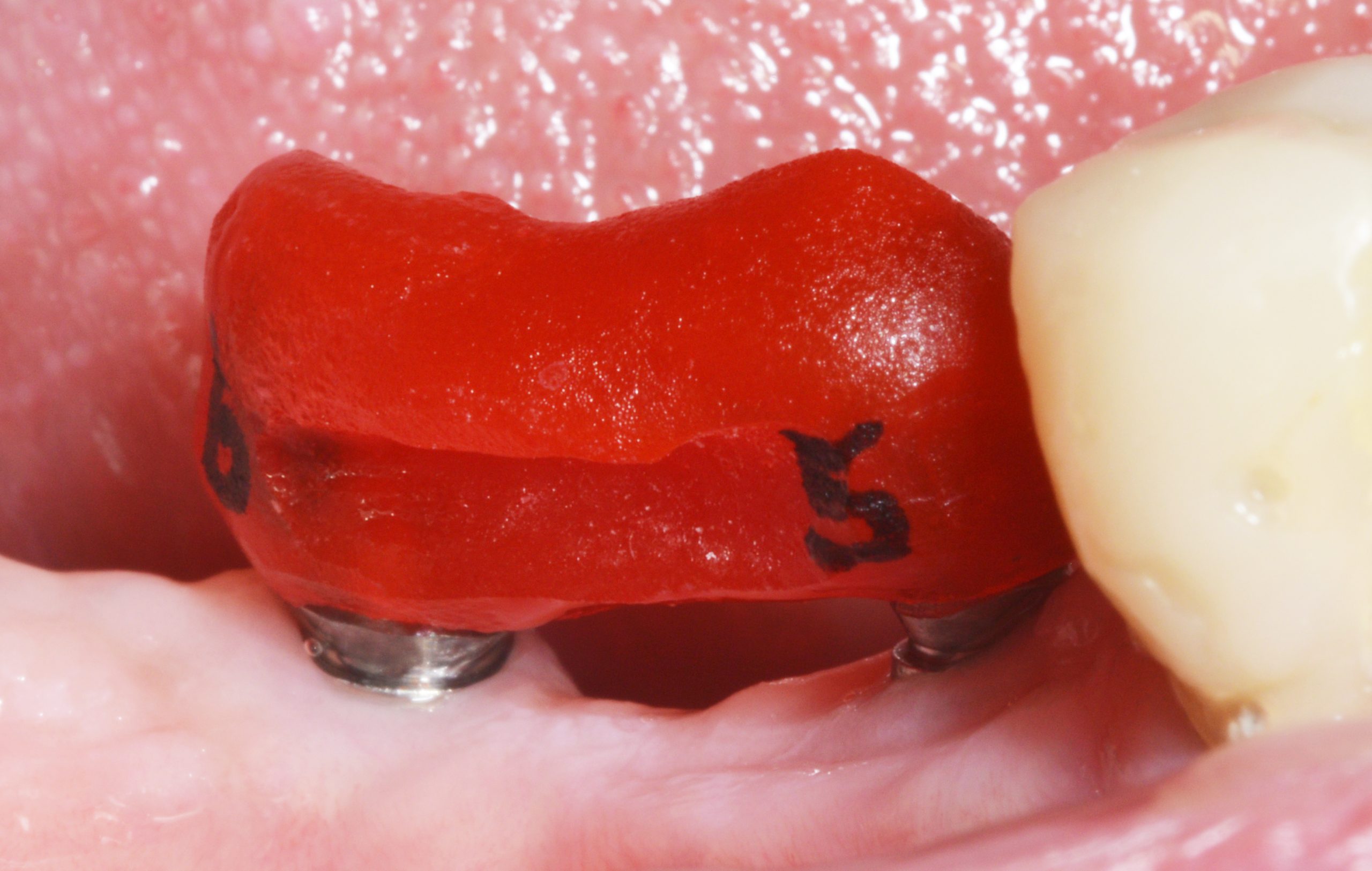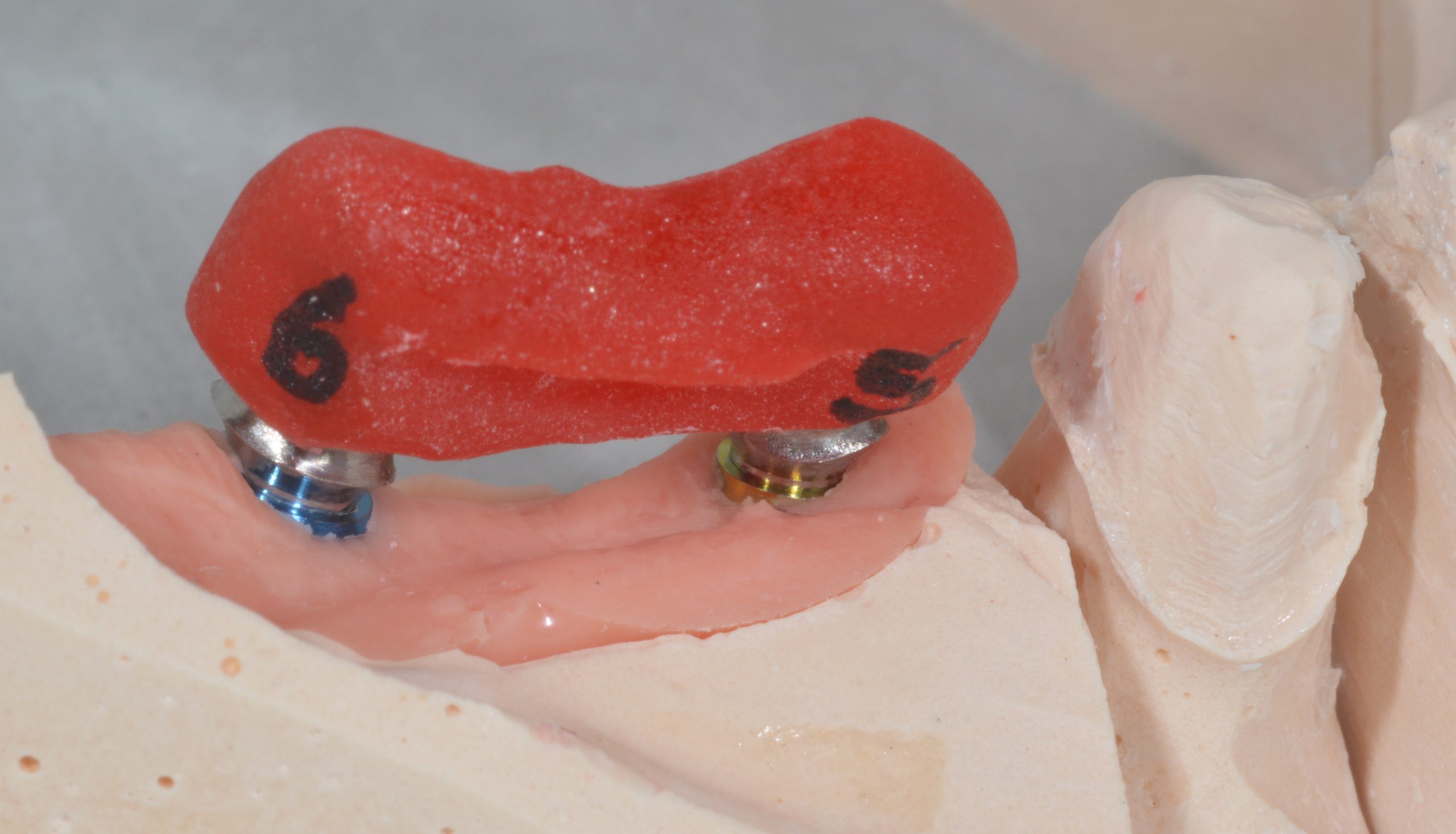 In the course of the treatment, the defective crown 44 was also redesigned. The implant fit was verified with an implant control splint to be on the safe side due to the very slight distortion that can never be ruled out when taking the impression.