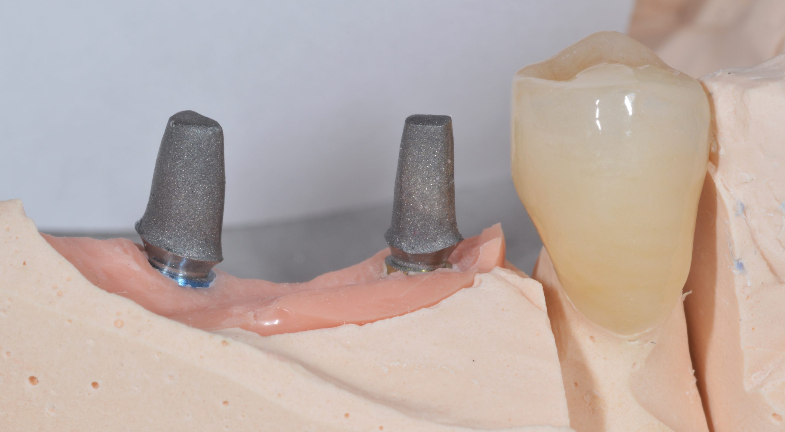 If possible, all implant prosthetics should be screw-retained to have quick “service access” in the event of bruxism-related screw loosening, for example. The master dental laboratory sandblasted the tried-in abutments.