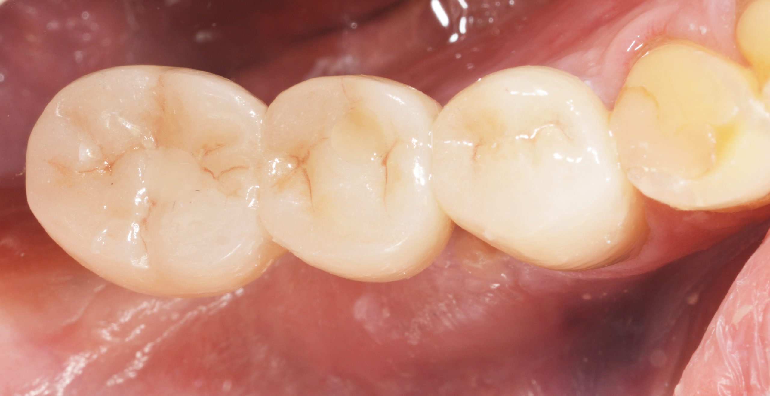 In addition, the dental technicians ensured a cleaning-friendly basal passage between 45 and 46. The handling of the interdental brushes was checked and the patient was instructed to attend a regular recall.